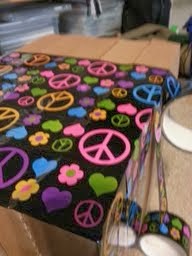 I folded in one side and stacked them, then went nuts taping row after row of peace sign, heart and flower duct tape I’d bought at the school supply clearance.